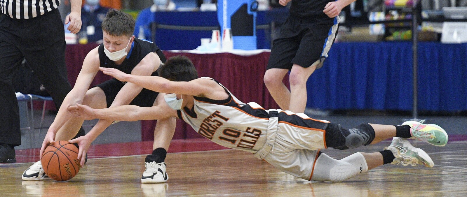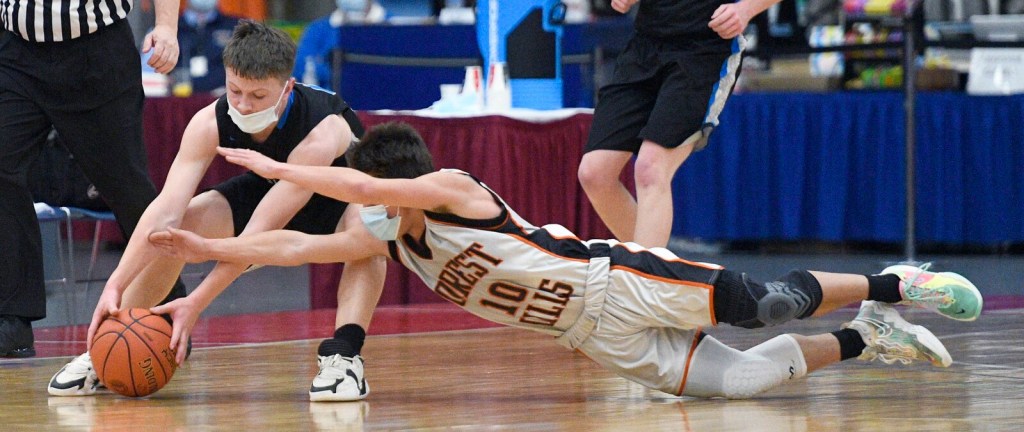 Forest Hills sophomore Braidan Welch dives for the ball by Greenvill defender Liam Mason during a Class D South boys basketball semifinal game Wednesday at the Augusta Civic Center. Andy Molloy/Kennebec Journal
