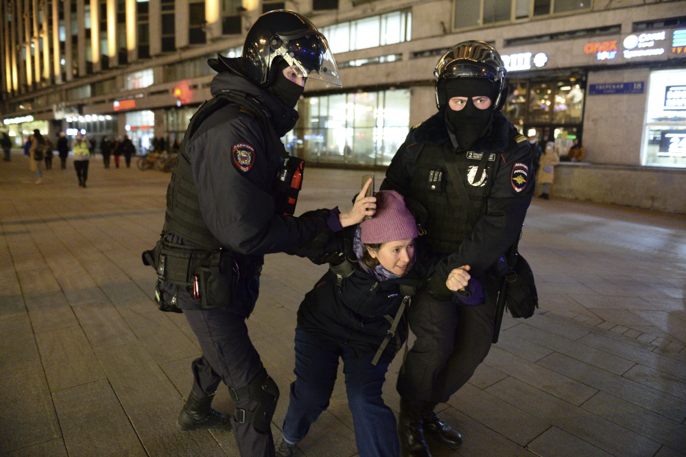 Police officers detain a woman in St. Petersburg, Russia, Friday, Feb. 25, 2022. Shocked Russians turned out by the thousands Thursday to decry their country’s invasion of Ukraine as emotional calls for protests grew on social media. Some 1,745 people in 54 Russian cities were detained, at least 957 of them in Moscow. AP Photo/Dmitri Lovetsky