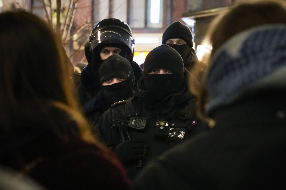 Police officers look at demonstrators in St. Petersburg, Russia, Thursday, Feb. 24, 2022. AP Photo/Dmitri Lovetsky