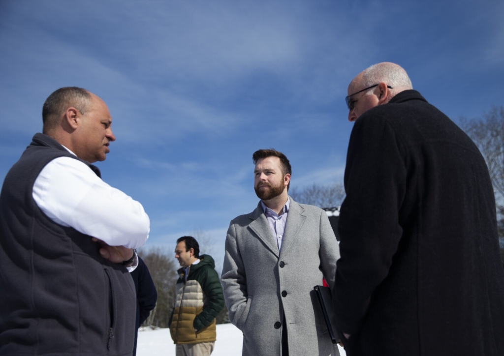 House Speaker Ryan Fecteau, center, promotes his affordable housing legislation during a tour of an accessory dwelling unit in Brunswick on Wednesday with Auburn Mayor Jason Levesque, left, and Dan Brennan, director of the Maine State Housing Authority. Derek Davis/Staff Photographer