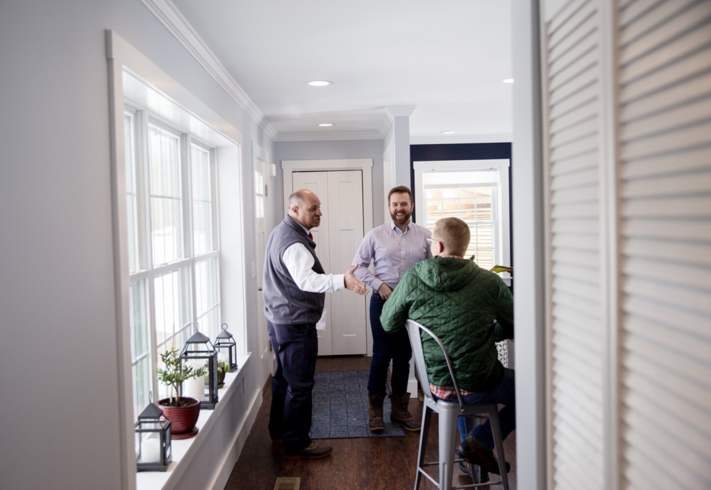 Auburn Mayor Jason Levesque, left, and House Speaker Ryan Fecteau, center, talk to Chris Lee of Backyard ADUs on Wednesday while touring a 780-square-foot, two-bedroom unit in Brunswick. Derek Davis/Staff Photographer