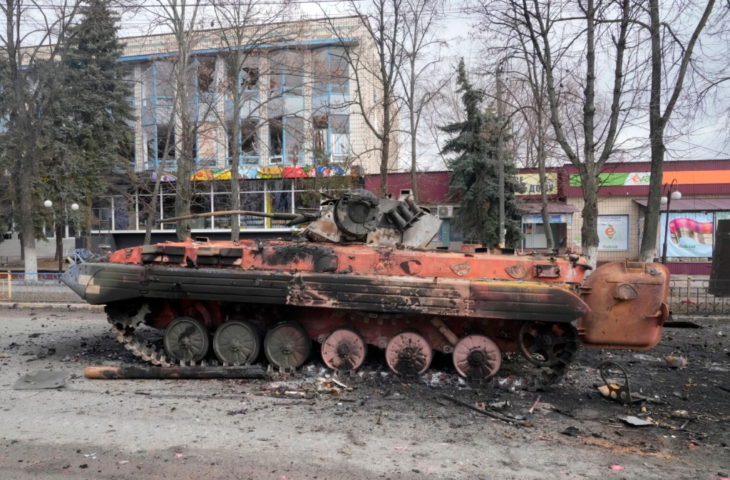A destroyed armored personnel carrier stands in the central square of the town of Makariv, 60 miles west of Kyiv, after a heavy night battle on Friday. Efrem Lukatsky/Associated Press