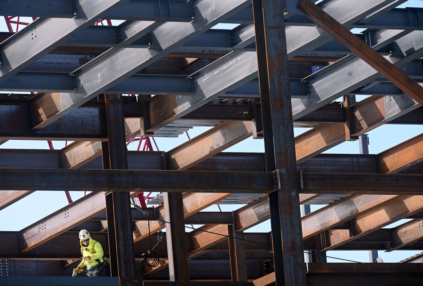 A worker is shown amid girders during the construction of the new Gordon Center for Creative and Performing Arts at Colby College in Waterville Tuesday. The $85-million, 74,000 square-foot center will open in the fall of 2023. Rich Abrahamson/Morning Sentinel