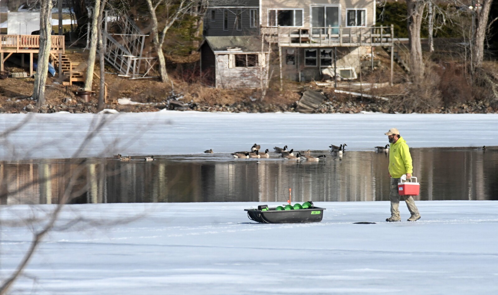 An ice fisherman carries gear near Canada geese on China Lake on Tuesday.  Rich Abrahamson/Morning Sentinel