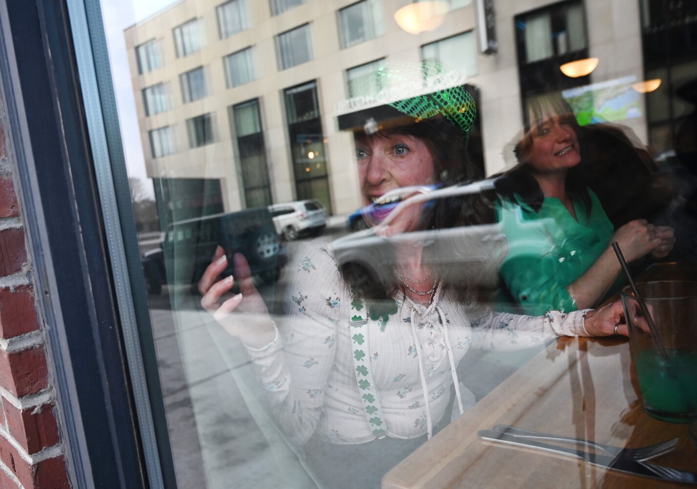 Lori Nelson, of Waterville, is shown with the reflection of Main Street as she celebrates St. Patrick’s Day with friends at a window table in the Silver Street Tavern in Waterville on Thursday. Rich Abrahamson/Morning Sentinel