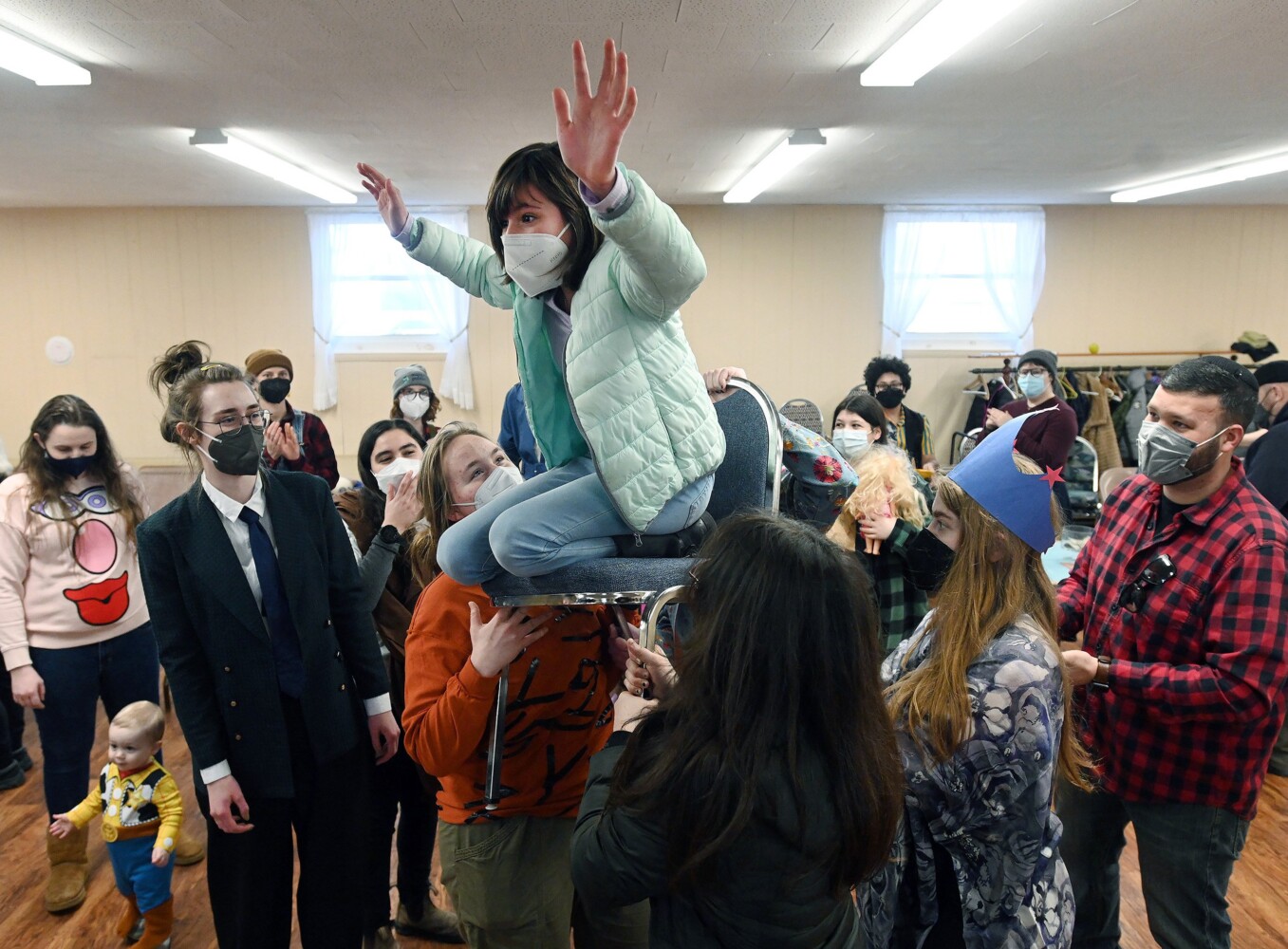 Rosie Gladstone, 11, is lifted on a chair during a celebration Wednesday at Beth Israel Congregation in Waterville marking the Jewish holiday of Purim. Rich Abrahamson/Morning Sentinel