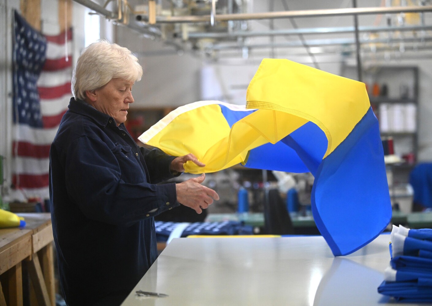 Sonya Mullin unfurls a Ukrainian flag before inspecting it for flaws Monday, March 14, at Maine Stitching Specialties in Skowhegan. The business began filling orders for the flag two weeks ago following Russia’s invasion. Rich Abrahamson/Morning Sentinel