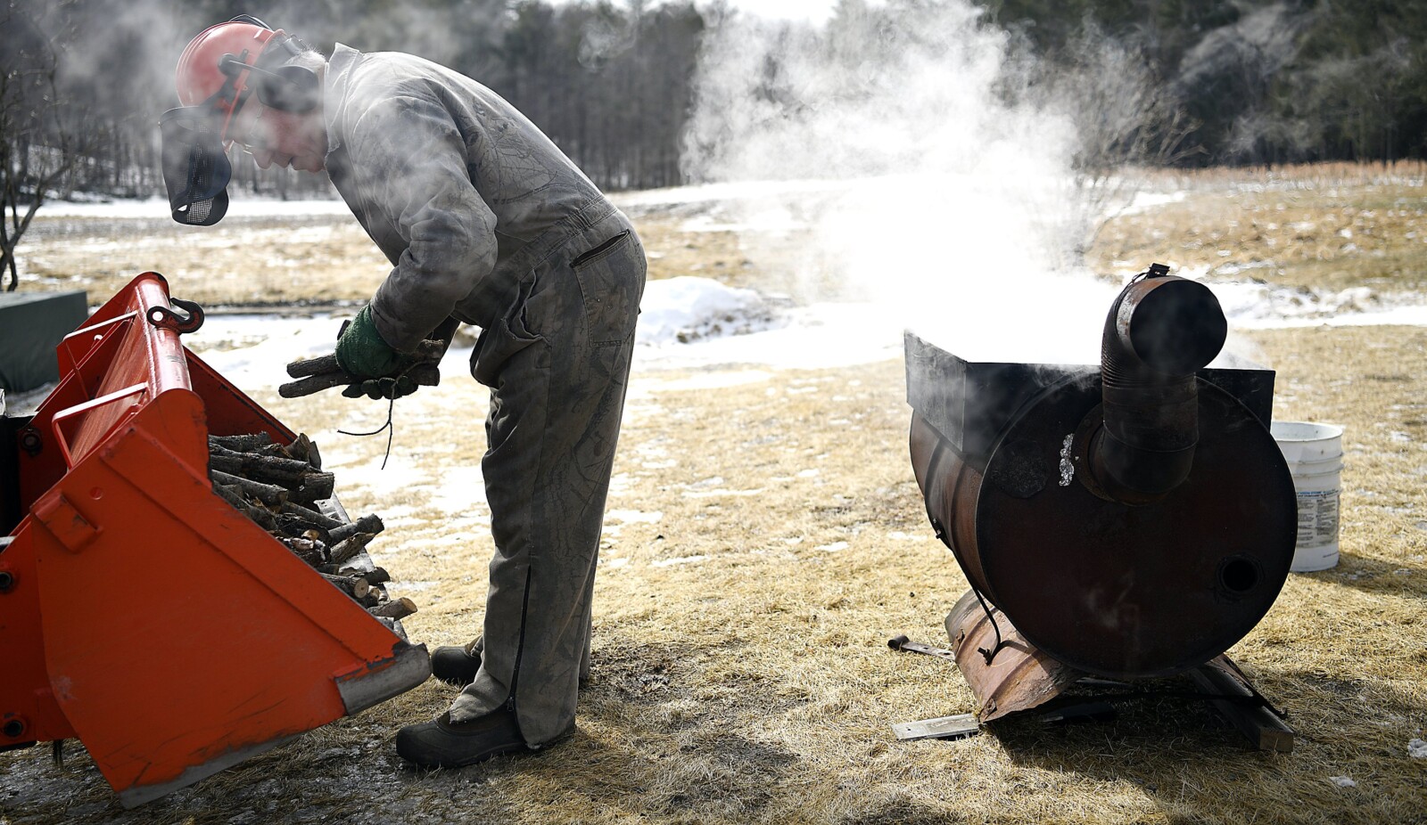 Bill Moulton collects wood from the bucket of his tractor Monday, March 14, to feed the evaporator at his Pittston farm. The 79-year-old farmer and logger said the maple sap flow this season has been “Stop. Go. Slow. Weird.” Andy Molloy/Kennebec Journal
