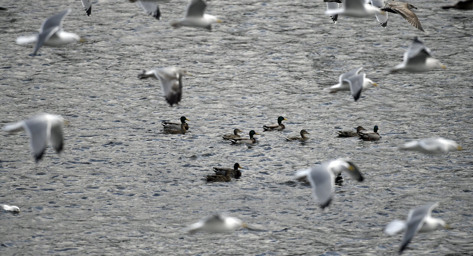 A flock of mallards is engulfed in a flight of gulls on the Kennebec River in Augusta on Thursday. Most of the ice that covered the river up to Augusta as recently as last week has melted. Andy Molloy/Kennebec Journal