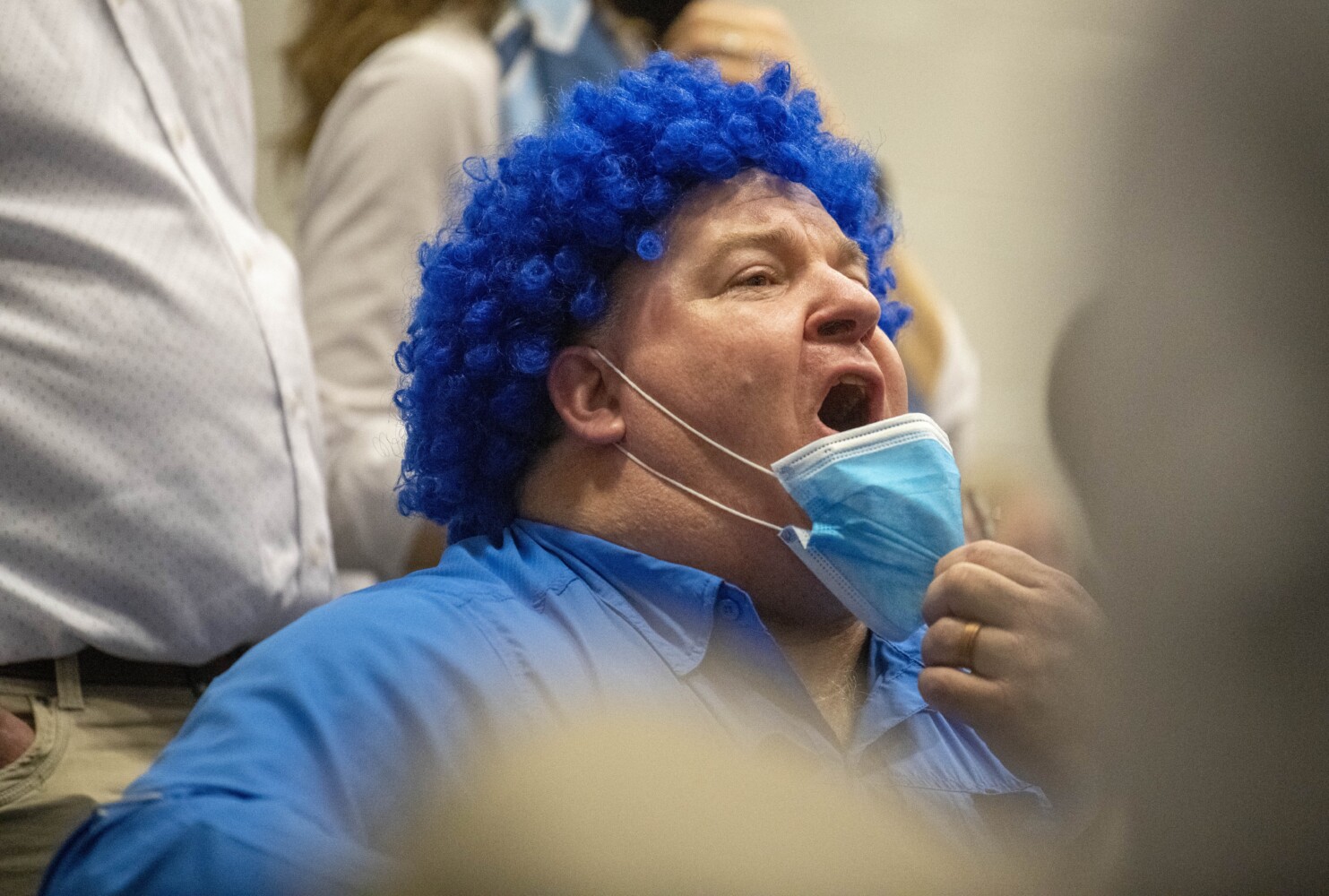 A University of Maine fan cheers on the team as the second half starts against Albany in the America East championship game at the UMaine campus in Orono on Friday, March 11. Michael G. Seamans/Morning Sentinel
