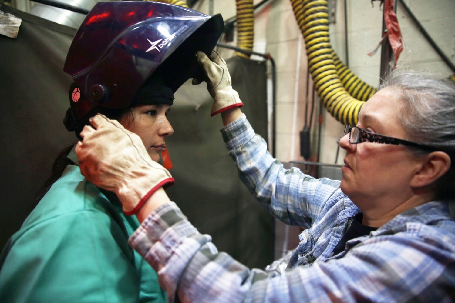 Lead instructor Penni Barbeau adjusts Audria Ariza’s welding mask on Ariza’s first day of welding at SMCC’s Midcoast Campus in Brunswick on Wednesday. Ben McCanna/Staff Photographer