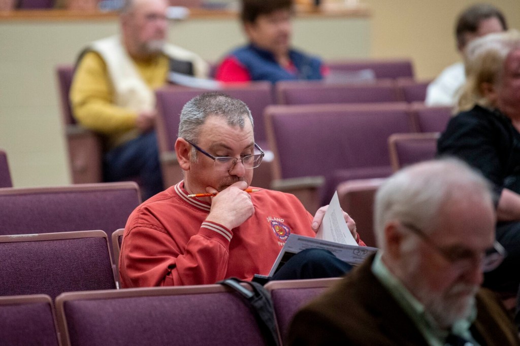 Town Councilor Don Borman listens Tuesday night as the proposed budget is introduced during the annual Town Meeting at the Messalonskee High School Performing Arts Center in Oakland. Michael G. Seamans/Morning Sentinel