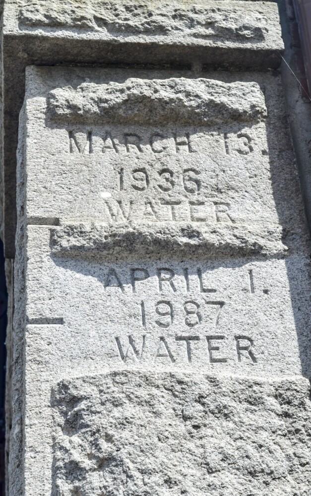 The tour included a stop at the corner of the appropriately named Water and Wharf streets, where lines etched into a granite column on the large building depicted how high the water reached in 1870, 1896, 1936, and 1987. Lines for the two most recent floods reached well over the heads of passers-by.