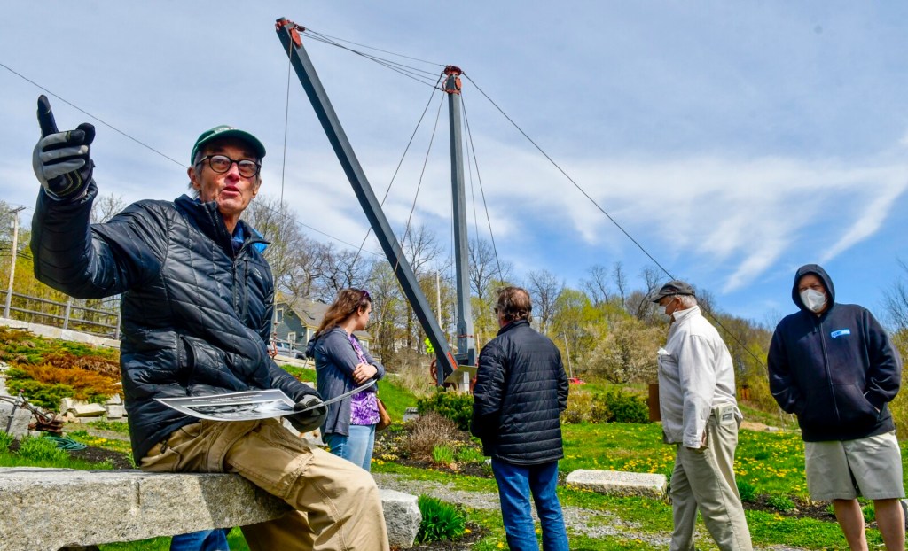 Gathered between the Kennebec River and a restored old wooden crane rescued from a local granite quarrying operation, Sam Webber, city historian, told tour participants the Hook, which later became Hallowell, was named for a bend in the Kennebec where ships would dock.