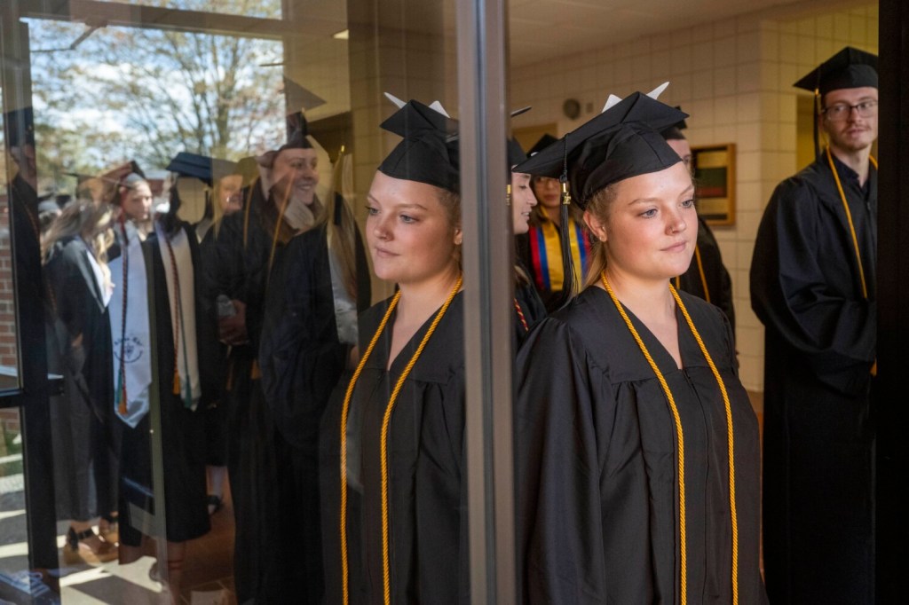 Thomas College graduates listen Saturday as Gregory W. Powell delivers the commencement address at Thomas College in Waterville. Michael G. Seamans