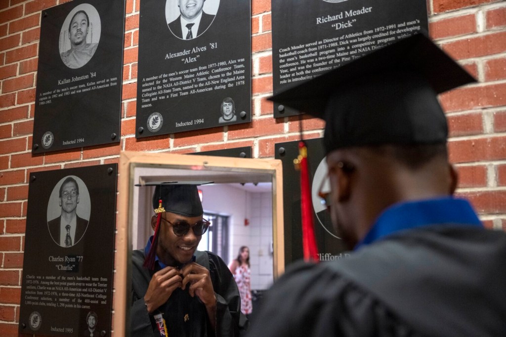 Thomas College graduate Rajhan Munnings prepares for commencement ceremonies Saturday at Thomas College in Waterville. Michael G. Seamans