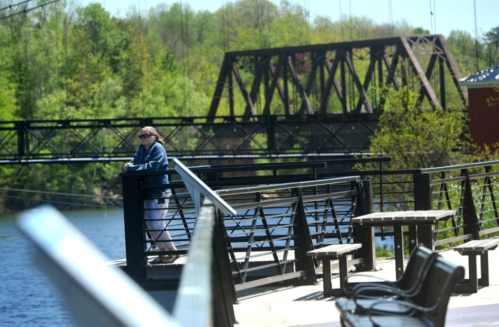 A woman pauses Wednesday to enjoy the view of the Kennebec River at the RiverWalk at Head of Falls in downtown Waterville. City officials are considering installing a camera security system at the park following repeated acts of vandalism and other illegal activity that is costing the city thousands of dollars. Rich Abrahamson/Morning Sentinel