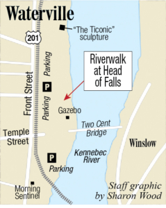 Walkers pass the Kennebec River on Wednesday as they travel along the RiverWalk at Head of Falls in downtown Waterville. Rich Abrahamson/Morning Sentinel