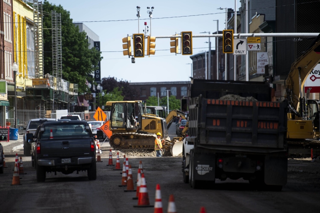 Crews continue road construction on Main Street in downtown Waterville on Wednesday as part of the ongoing downtown revitalization project. Streets elsewhere in the city also will get a facelift after the City Council on Tuesday voted to award more than $2 million in paving contracts. The vote means 18 streets in the South End will be paved starting in late summer. Michael G. Seamans/Morning Sentinel