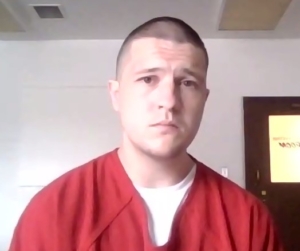 Ethan J. Rioux-Poulios of Woodstock appears in Oxford County Superior Court by videoconference from Oxford County Jail where he denied a dozen charges stemming from a police chase and crash in March. Screenshot from video