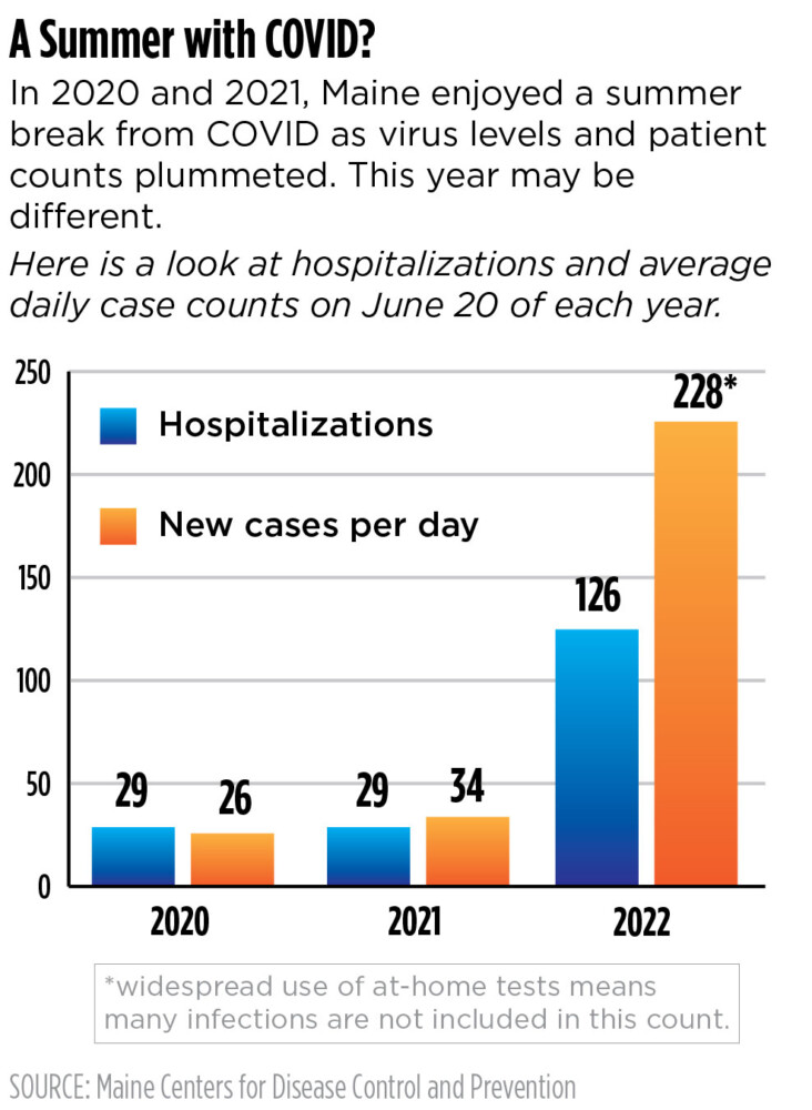 In Maine, COVID cases and patient counts dropped sharply in June the past two years before remaining at low levels through much of the following summers.