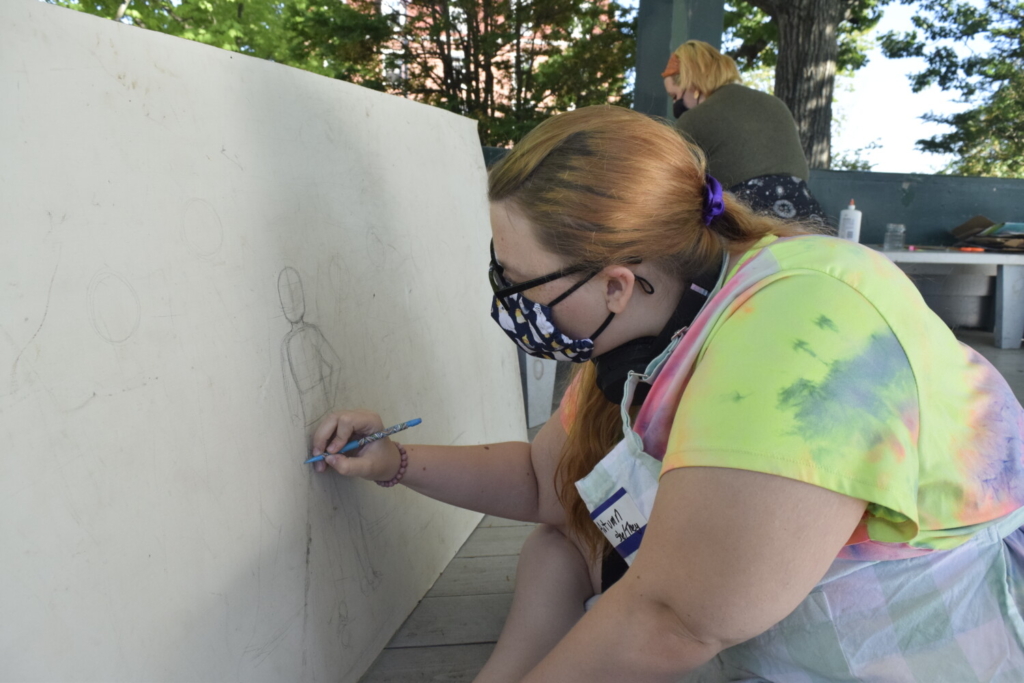 Farmington will be host to its first LGBTQ+ pride festival Saturday from 11 a.m. to 5 p.m. in downtown. Organizers gathered Monday night to start decorating Meetinghouse Park, where the festival will be held following a march. Autumn Fournier sketches the beginnings of a mural that will eventually be covered in characters and rainbow flames. Kay Neufeld/Franklin Journal
