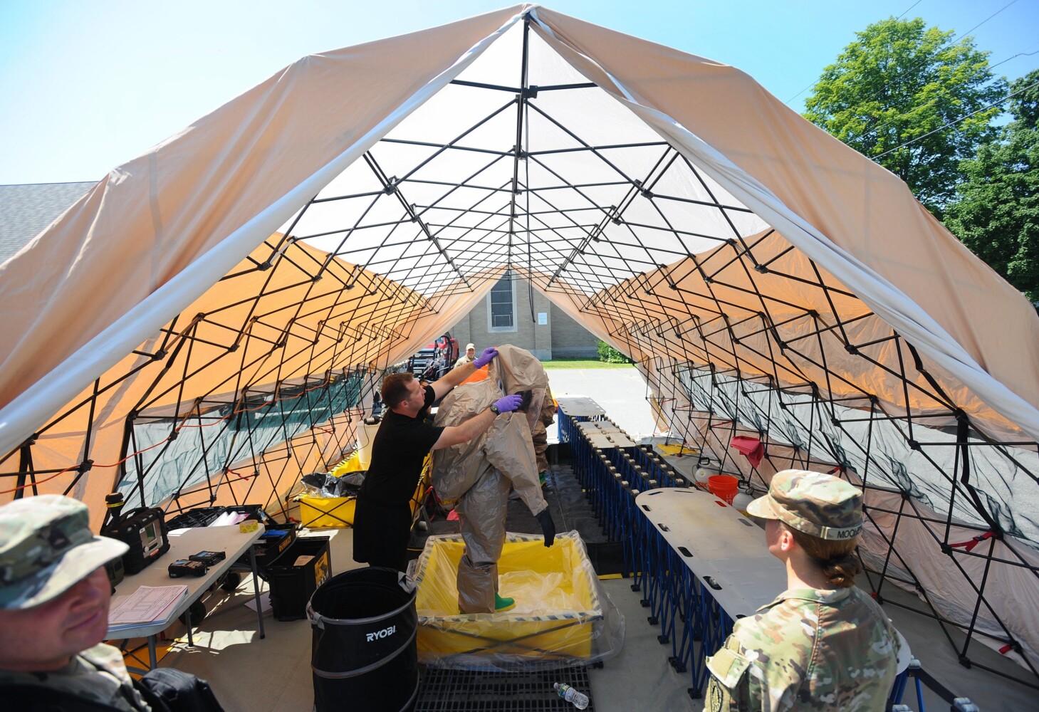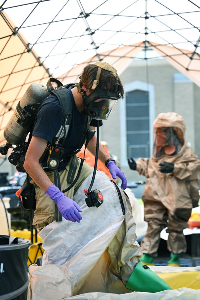 Skowhegan firefighter Colby Fowler, center, is assisted by Army Sgt. Rollin Noyes as Fowler prepares to climb out of a hazardous materials suit Wednesday while undergoing the decontamination process that was part of a training exercise in downtown Skowhegan.
