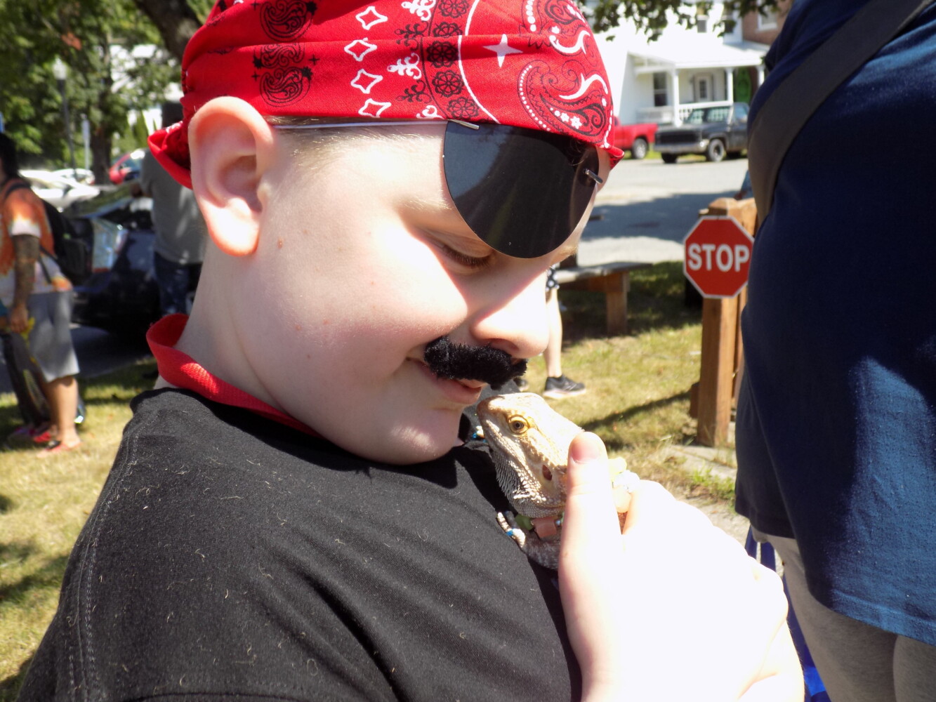 Dante Pike of Livermore Falls holds Luna, a four-year old bearded dragon, Saturday morning in Farmington. The lizard is an emotional support animal owned by Brynn Dakin of Farmington who brought her sister to Summer Fest. It was too hot for Luna to wear her shark costume, she said. Pam Harnden/Livermore Falls Advertiser