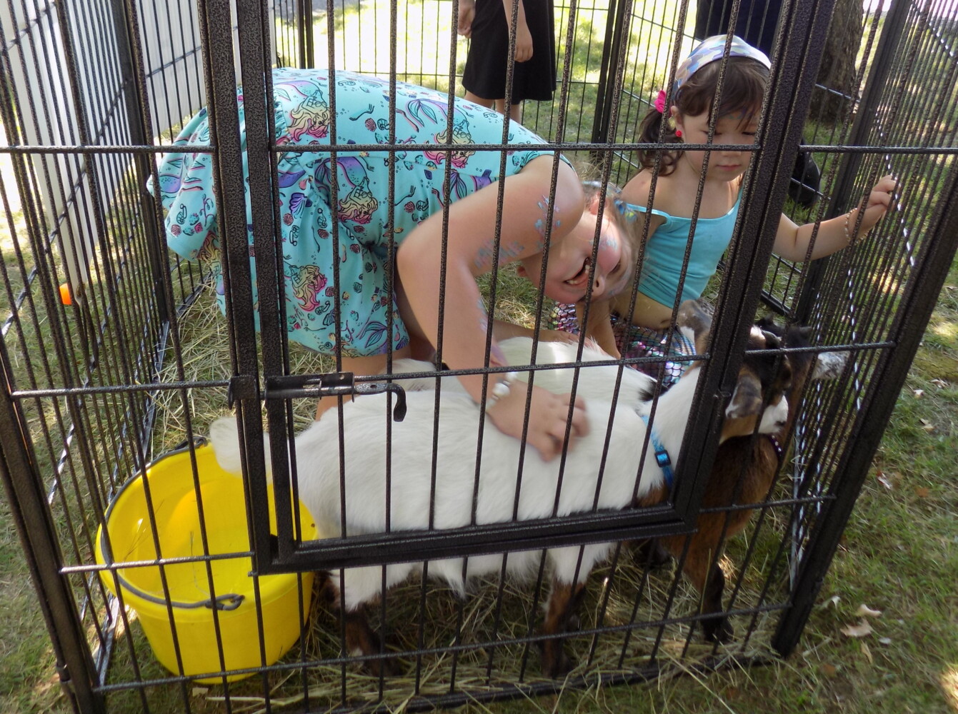 Charlotte Dakin pets a five-month old goat kid while Reya Rothert, both of Farmington, looks at the goats Saturday morning in Farmington. During Summer Fest, numerous kid-friendly activities and free foods were available in Meetinghouse Park. Pam Harnden/Livermore Falls Advertiser