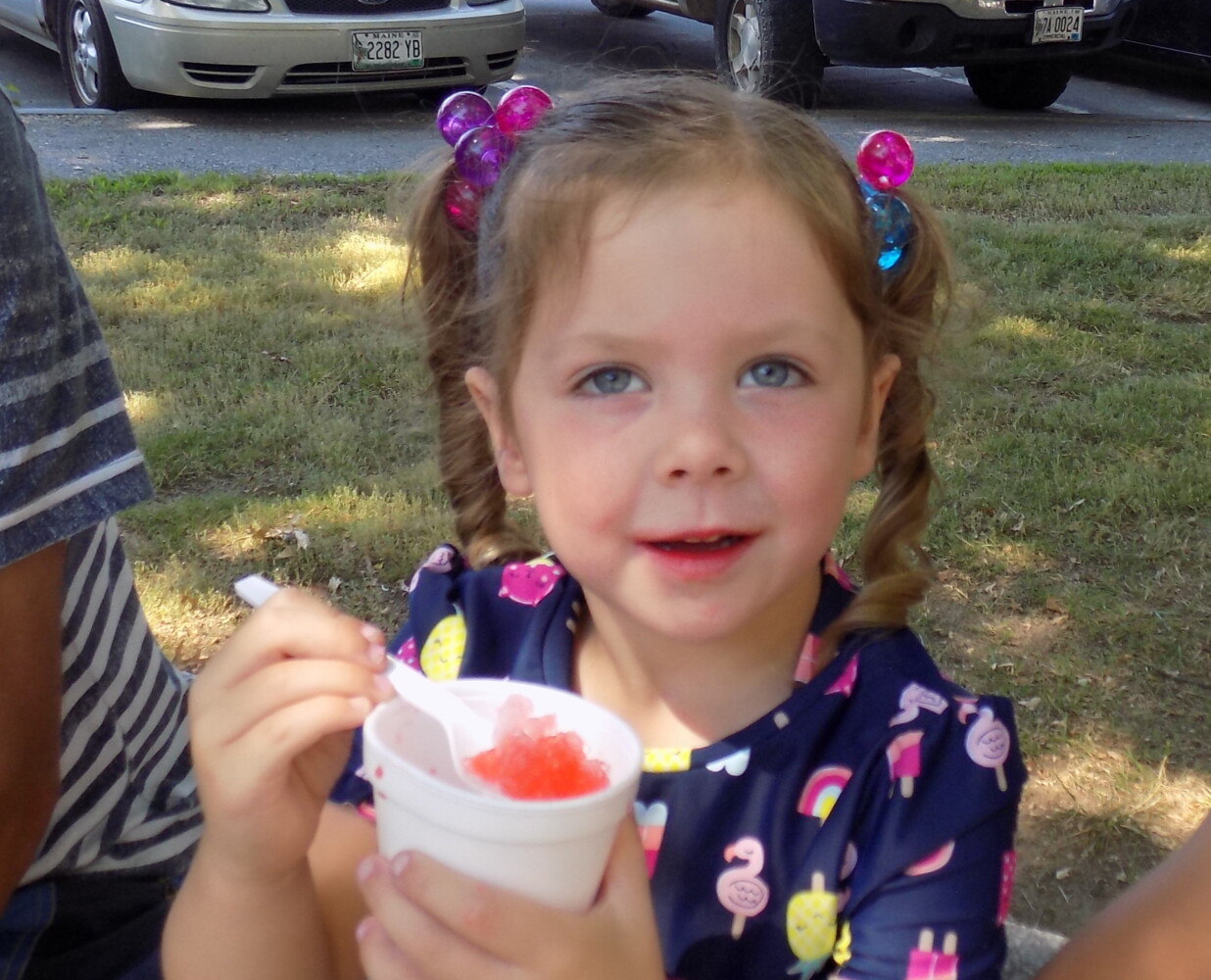 Madeline Meuse of Farmington enjoys a Sno-cone Saturday morning in Farmington’s Meetinghouse Park. The park was filled with children and their relatives during Summer Fest. Pam Harnden/Livermore Falls Advertiser