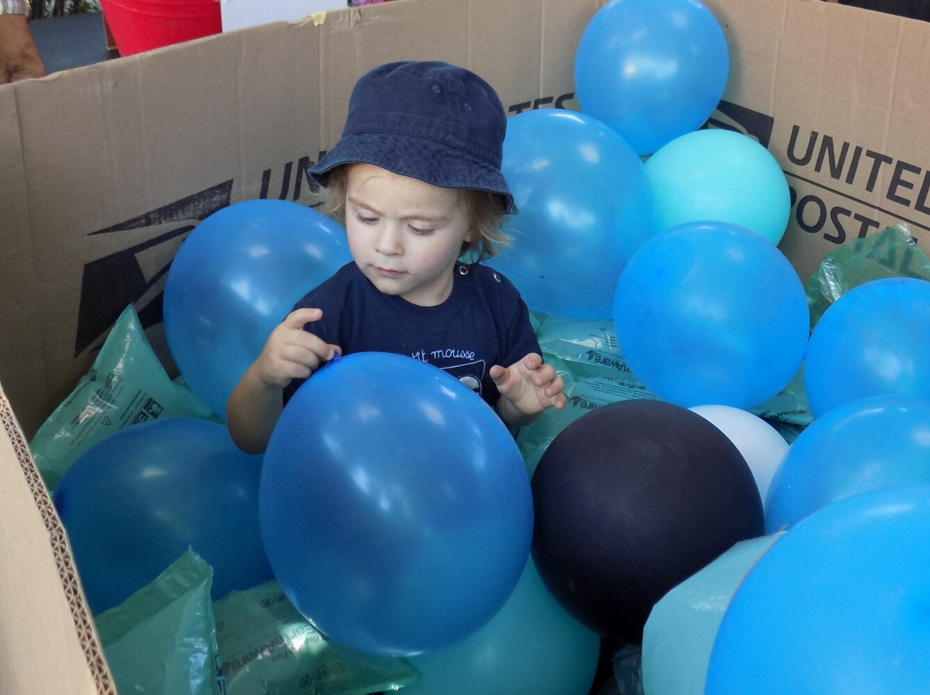 Marceau Glady Jordan of France checks out a bin of balloons in Meetinghouse Park Saturday morning during Summer Fest in Farmington. Jordan’s mom is from New Sharon. Pam Harnden/Livermore Falls Advertiser