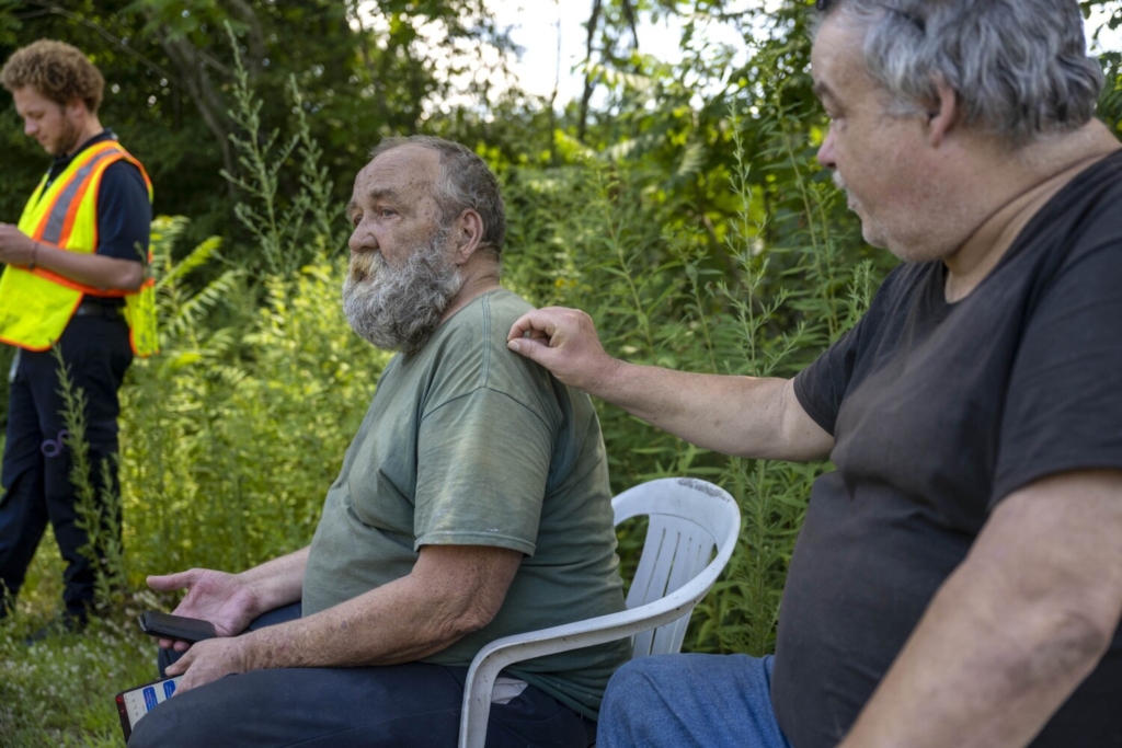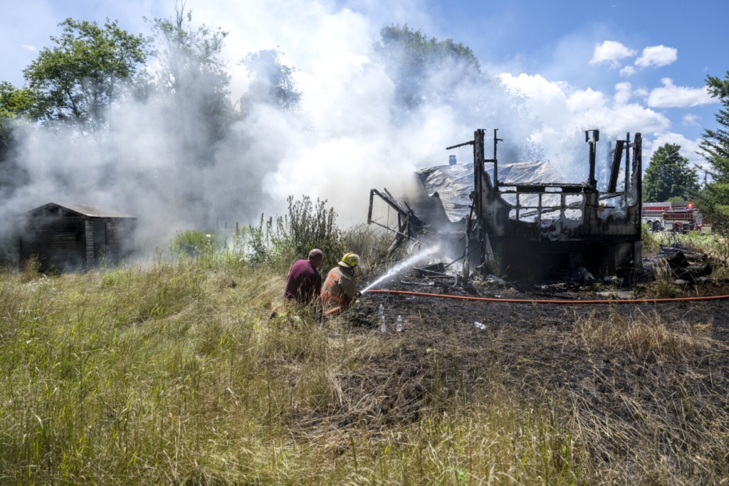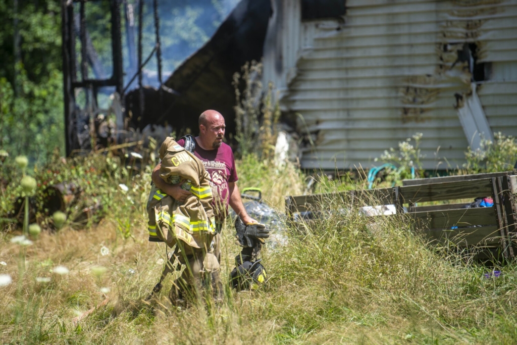 Randy Baxter, 46, points Wednesday in the direction of the front yard in South China as he and his roommate, Richard Norton, seated at right, watch firefighters battle a fire at their trailer home at 261 Lakeview Drive. Norton’s 15-year-old Rottweiler died in the fire. Norton says it is not clear how the fire began, but it might have been an electrical problem. The men say they are waiting to hear from the American Red Cross on options for temporary housing.