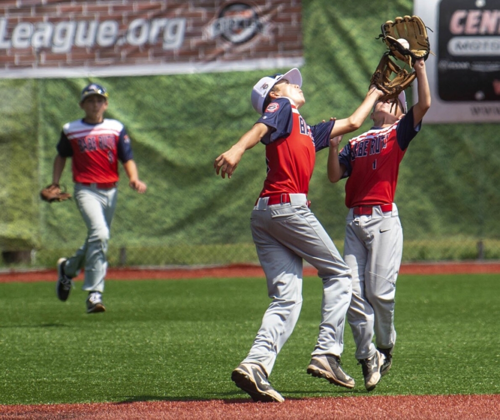 Central Vermont shortstop Miles Lawrence nearly collides with second baseman Andrew Langlois (1), who made the catch during the Cal Ripken 12U World Series on Saturday at Little Wrigley Field in Waterville. Michael G. Seamans/Morning Sentinel