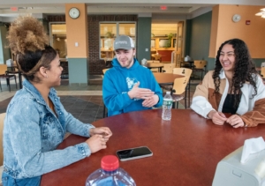 Rising second-year students Emily Strachan of Lewiston, left, Ryan Crockett of Old Orchard Beach, center, and Kali Thompson of Waterville gather April 26 at the dining commons at Central Maine Community College in Auburn. Andree Kehn/Sun Journal file photo