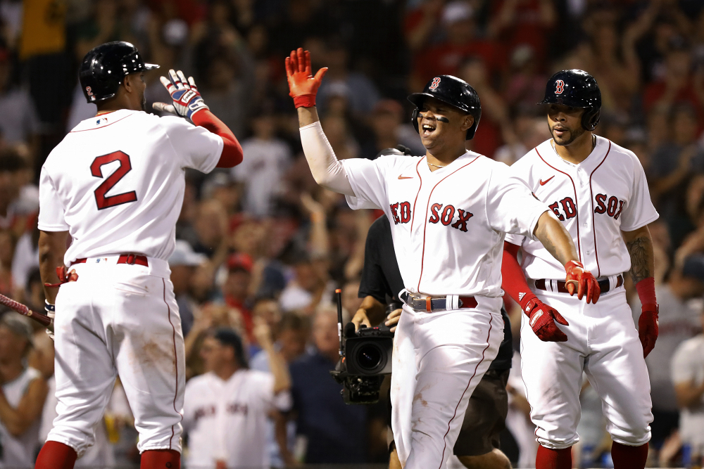 Rafael Devers, center, high-fives Xander Bogaerts at home plate as Tommy Pham looks on after Devers hit a two-run homer Sunday night during Boston’s 3-0 win over the New York Yankees at Fenway Park. Paul Connors/Associated Press
