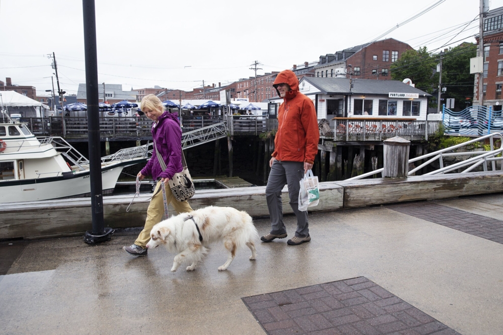 Karen and David Batten walk with their miniature Australian shepherd, Roam, in the Old Port on a rainy Labor Day. The couple from Milwaukee, Wis., was visiting Maine while touring the East Coast. Derek Davis/Staff Photographer