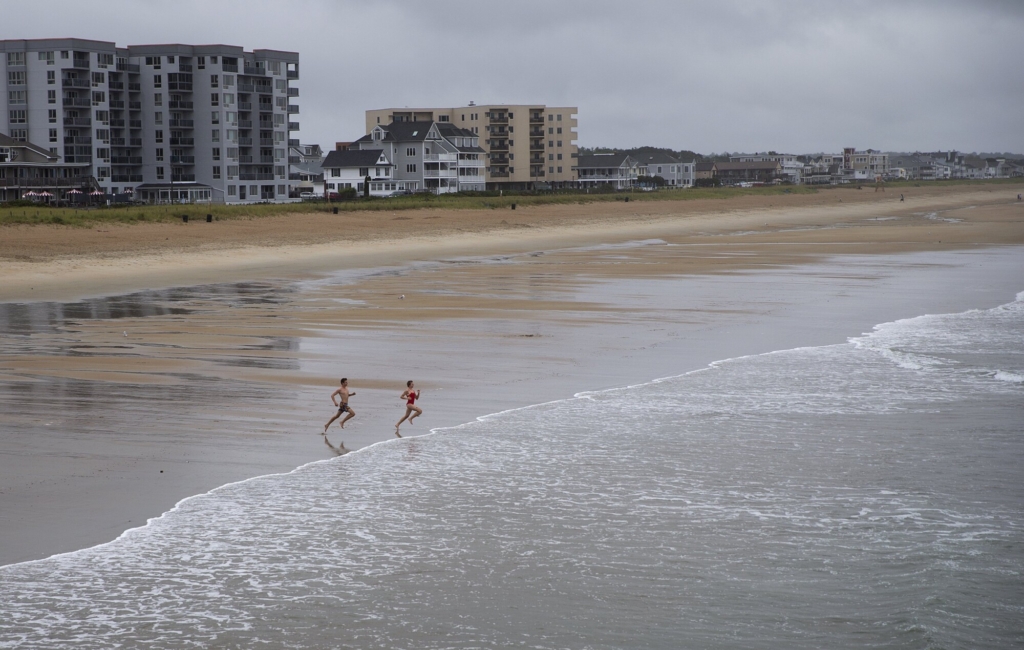 The beach was mostly empty on a rainy Monday in Old Orchard Beach, except for these two swimmers who raced down to the water on the final day of the summer tourism season. Derek Davis/Staff Photographer