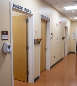 The health suite at Cony Middle and High School in Augusta. The first two doors are currently used by nurses and the last one is planned to be used by a doctor or physician assistant when they’re added to staff. The Augusta high school recently received a grant from the Maine Center for Disease Control & Prevention to establish a more robust school-based health center that will bring doctors and physician assistants into the school. Joe Phelan/Kennebec Journal