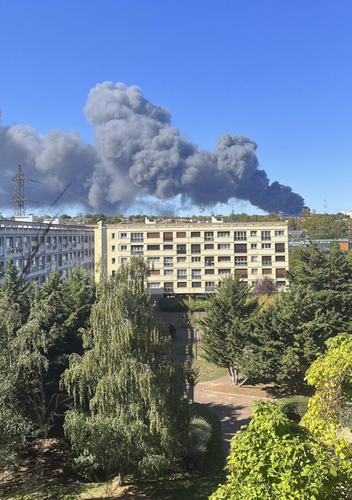 Smoke rises from a warehouse blaze Sunday at a produce market in Paris’ southern suburbs. Associated Press