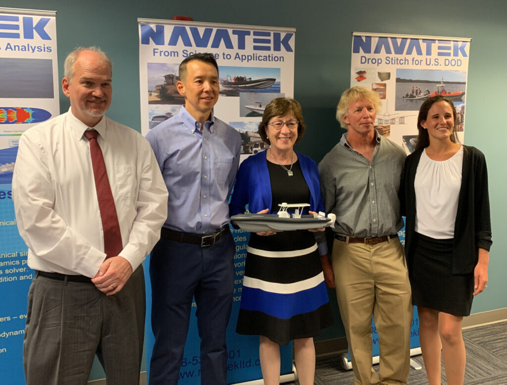 In August 2019, the senator joined Kao for a news conference in Portland to announce the $8 million award, noting that she had “strongly advocated for the funding” on the Defense Appropriations subcommittee. Kao thanked Collins for her support, which allowed the firm to build experimental hulls in conjunction with Belfast-based Front Street Shipyards. The firm had 22 employees at its Portland office at the time and said it would be adding 28 more as a result of the contract.