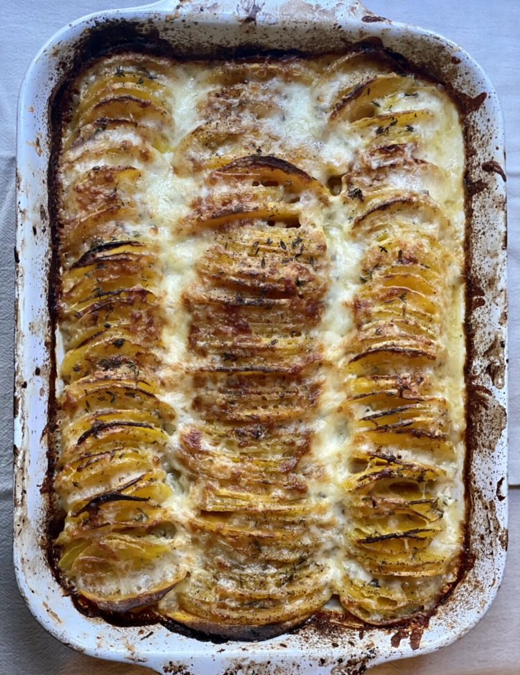 This recipe is adapted from one published for Hasselback potato gratin by food science writer J. Kenji López-Alt. Hasselbacking, which originated at the Hasselbacken Hotel in Stockholm, Sweden, is a cooking method in which potatoes or other items are sliced not-quite-all-the-way through in thin, even layers, and stuffed or topped with additional flavorings. It is tough to slice a winter squash not-quite-all-the-way through, but you can stand the slices up on their sides as a way of creating more surface area for the starchy main ingredient to crisp up.