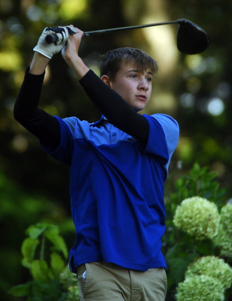 Nathan Choate of Erskine tees off on Tomahawk’s No. 18 during the Kennebec Valley Athletic Conference golf state qualifier Tuesday at Natanis Golf Course in Vassalboro. Rich Abrahamson/Morning Sentinel