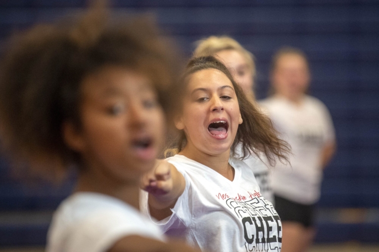 Destiny Baker, foreground, and Hannah King, center background, practice a routine with the Waterville/Messalonskee co-op cheering squad Sept. 29 in Waterville. Michael G. Seamans/Morning Sentinel