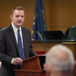 Assistant Attorney General John Risler delivers his opening statement to jurors. Gregory Rec/Staff Photographer