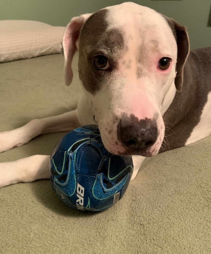 Olive, Christine Cain’s pit bull, is the namesake of her brewery, Olive Pit Brewing in Lisbon Falls. Christine Cain photo