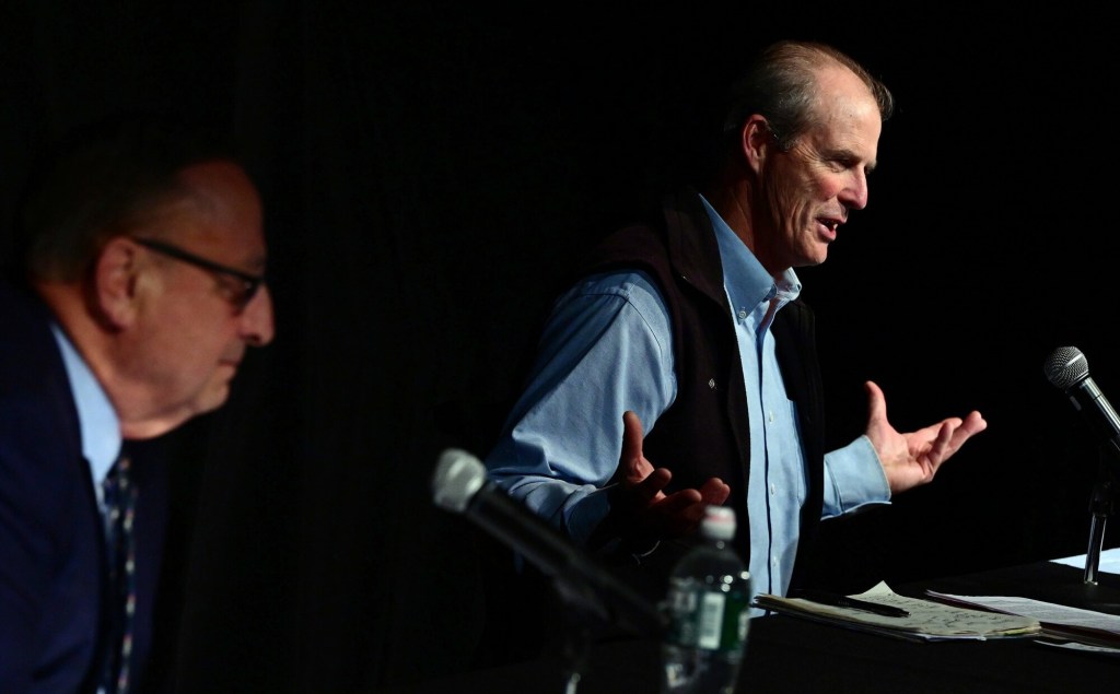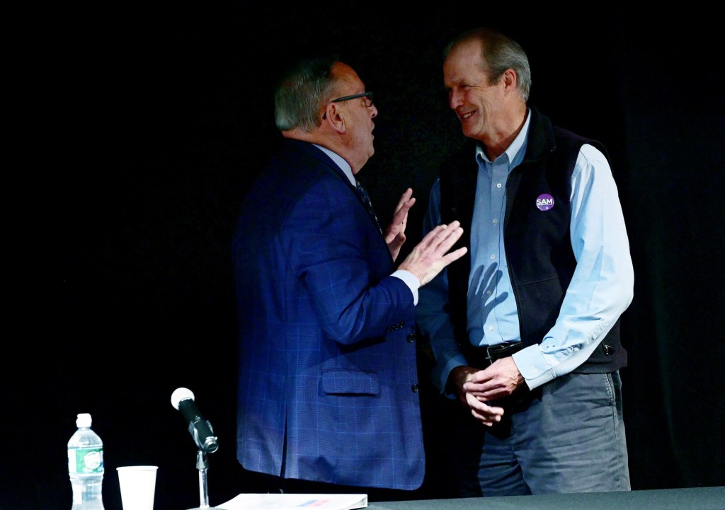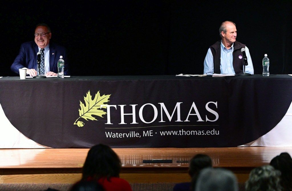 Independent candidate Sam Hunkler, right, fields a question from the moderator as former Republican Gov. Paul LePage waits his turn to speak Tuesday during a forum discussing issues of the gubernatorial race at Thomas College in Waterville. Rich Abrahamson/Morning Sentinel