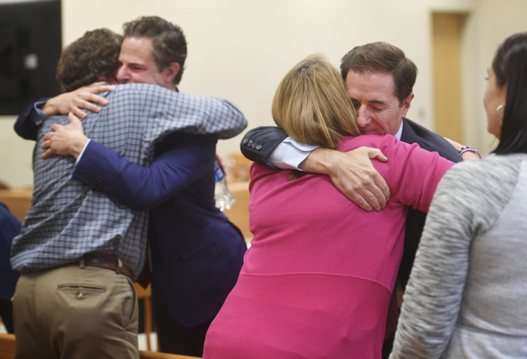 Plaintiff William Sherlach, left, hugs attorney Josh Koskoff while plaintiff Nicole Hockley hugs attorney Chris Mattei following the jury verdict and reading of monetary damages in the Alex Jones defamation trial at Superior Court on Wednesday in Waterbury, Conn. Brian A. Pounds/Hearst Connecticut Media/Pool via Associated Press