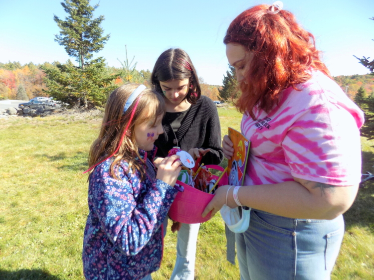 From left Penelope Farrar and Gabby Doyon look through a basket of prizes held by Jolene Luce, director of Western Maine AHEC Saturday afternoon, Oct. 8, during the Fall Block Party at Franklin Memorial Hospital in Farmington. Pam Harnden/Livermore Falls Advertiser