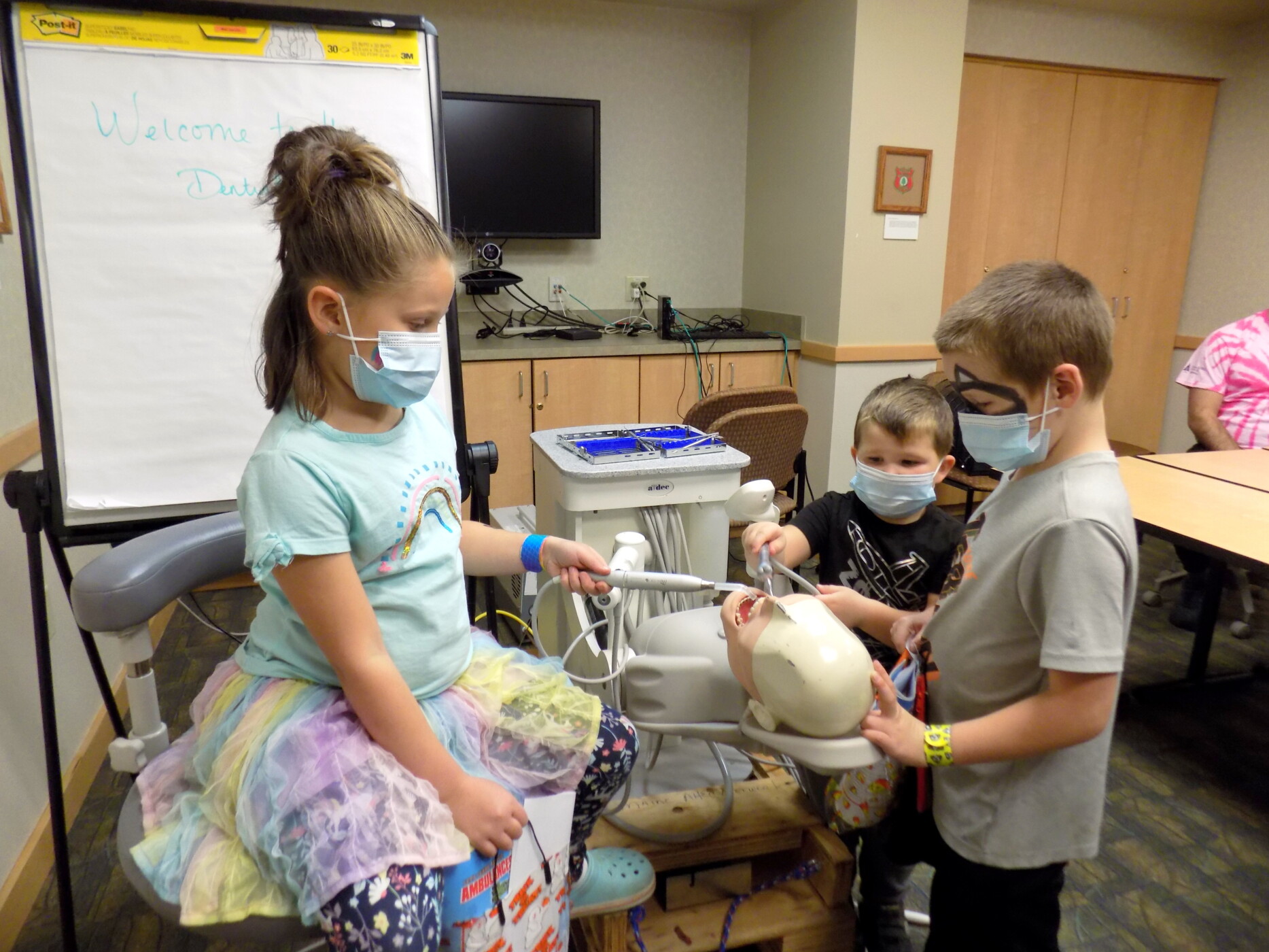 Siblings Annie, Jameson and Sawyer Tracy of New Sharon were seen trying out various dental instruments on a mannequin.