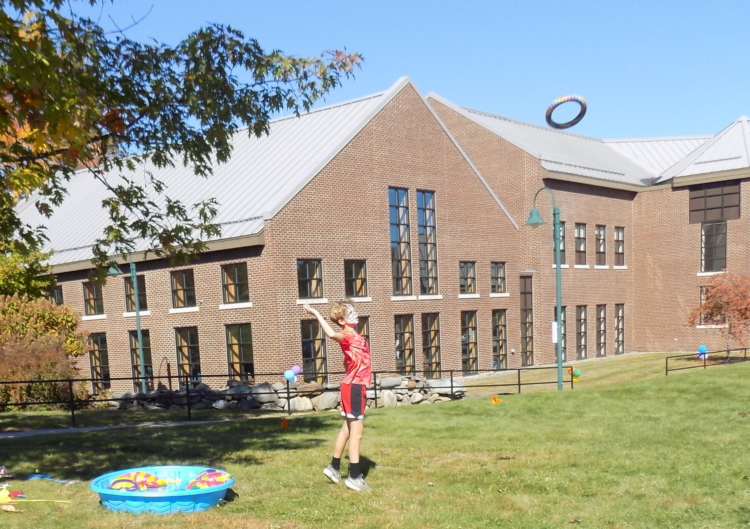 The face of James Smith of Farmington was brightly painted white with grey stripes. He practiced his skill at tossing rubber rings over pumpkins set out on the lawn in several rows some distance away. Luce exclaimed along with him after he threw one ring that landed atop the furthest pumpkin.